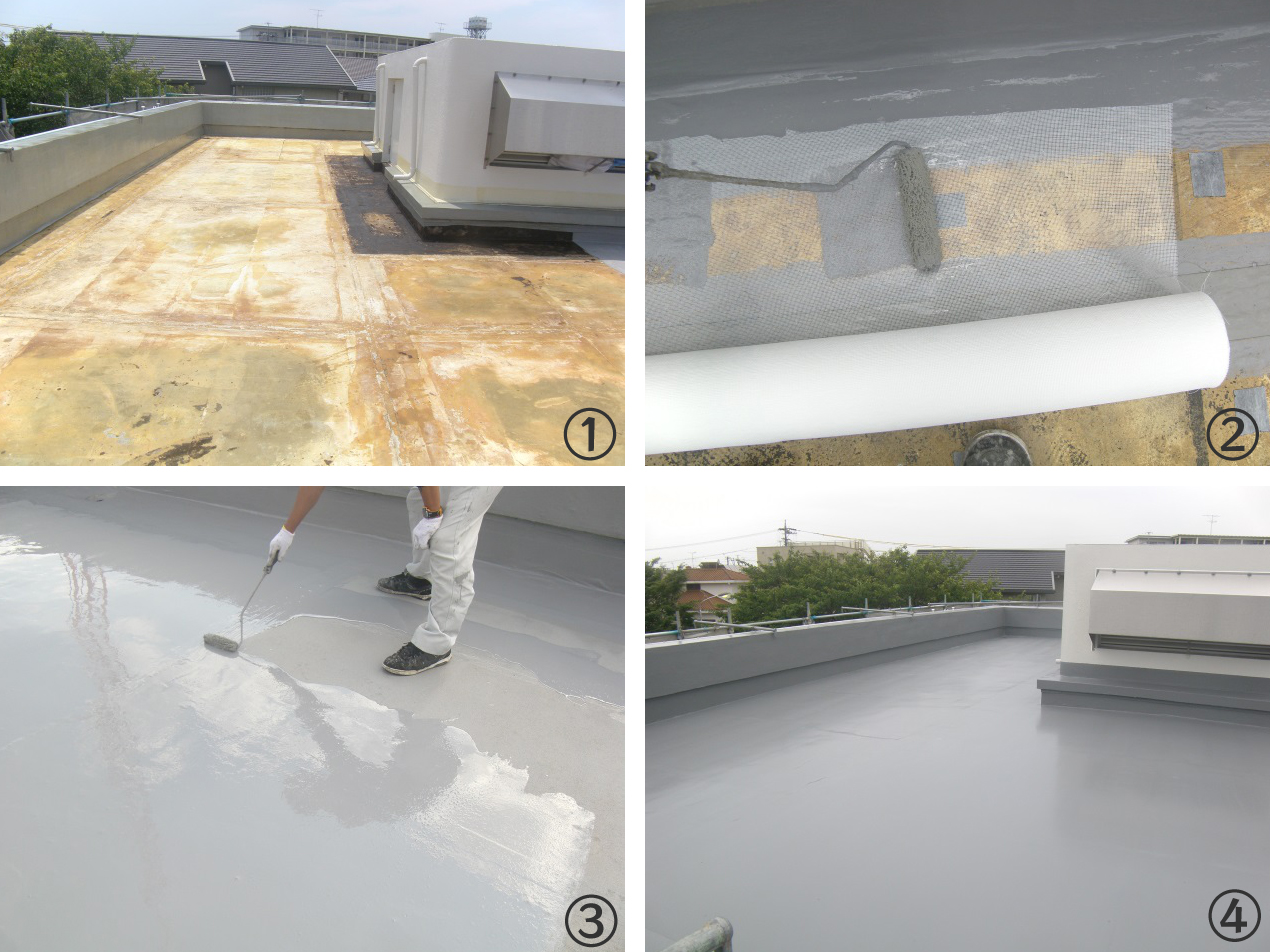 | FRP防水 | FRP防水は、軽量かつ耐久性に優れています。金属や木部、コンクリートなどの表面に施工できることから、現在様々な場所で活躍している防水工法です。 |